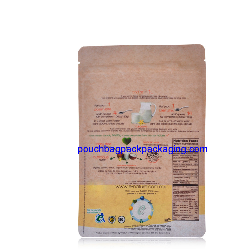 | Item: | Zip lock kraft paper pouch bag, stand up kraft zipper bag for coconut milk | Material: | PET/kraft paper/PE, PET/VMPET/ kraft paper /PE, or custom |